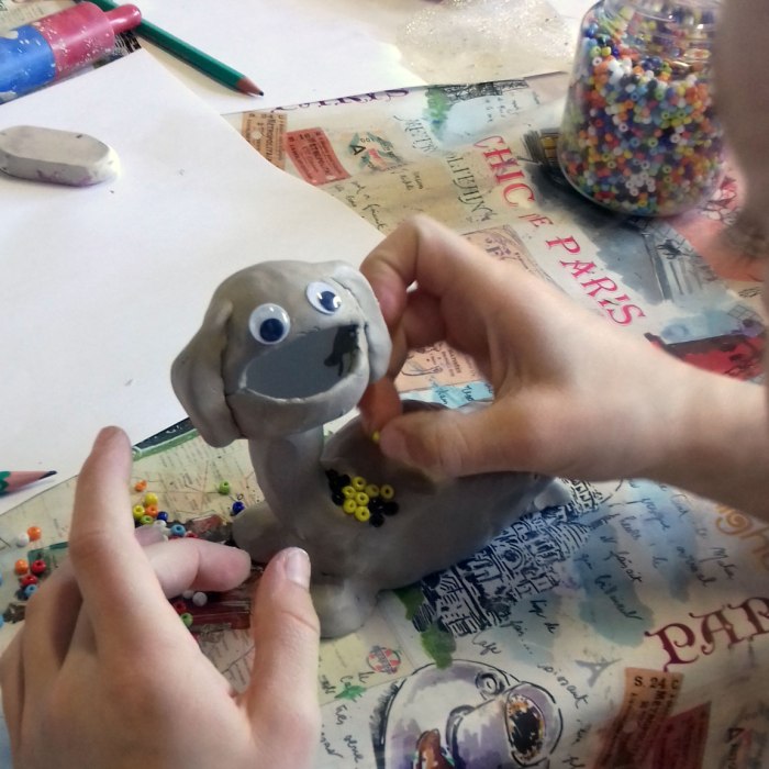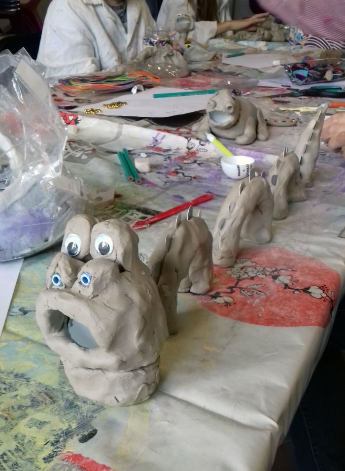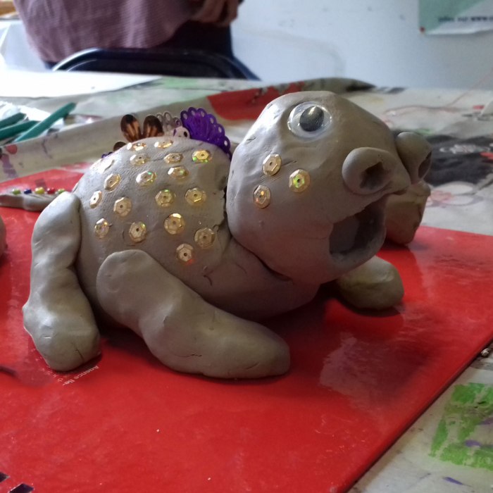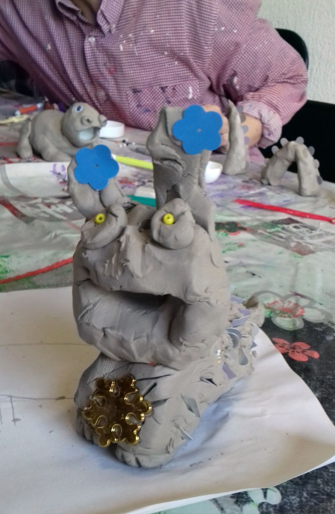 Afin de nous plonger dans l’ambiance, nous avons commencé l’atelier par la lecture d’un extrait du livre « Le livre des êtres imaginaires » de Jorge Luis Borges. Puis nous nous sommes lancés dans la création de notre propre animal imaginaire avec de la terre glaise. Notre animal devait en plus avoir quelque chose de fantastique : une cachette magique pour un objet magique (dans une balle de ping pong) !