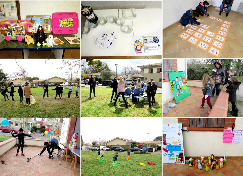 Tous les ingrédients étaient là : une belle décoration réalisée le matin, de nombreux participants, des copains du monde qui animaient, en binôme avec un adulte, des jeux de kermesse (tir à la corde, course en sac, chaises musicales), éducatifs (chamboul’tout des inégalités, quilles et mémory des droits des enfants, jeux des abeilles et tri des déchets sur l’environnement), créatifs (décorations de Pâques) et musicaux (chorale de la basse cour). La chasse a été fructueuse et chacun récompensé avec des œufs en chocolat et un goûter offert. Le maxi œuf surprise a été trouvé par Noah. Pour terminer les lots de la tombola ont été tirés par Pauline !