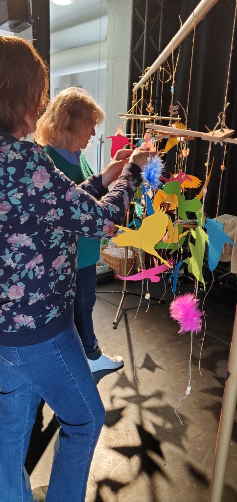 Ceux qui le désiraient, petits et grands pouvaient créer leur mobile, en assemblant 2 bouts de bois, des ficelles et en enfilant des perles, des oiseaux, des plumes et d’autres accessoires à disposition. Les participants repartaient avec leur création personnalisée et hautes en couleurs pour décorer leur chambre.