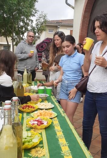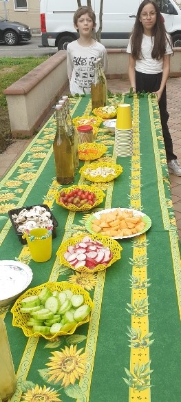 Et il a été préparé un « apéro santé » que nous avons offert aux parents pour rappeler que bien manger c’est aussi rester en bonne santé ! Ainsi nous avons pu déguster des lamelles de carotte, rondelles de concombre, quartiers de tomate, tranches de melon, morceaux de pomme …. accompagnés d’eau aromatisée au citron, à la menthe et aussi à la vanille malgache!