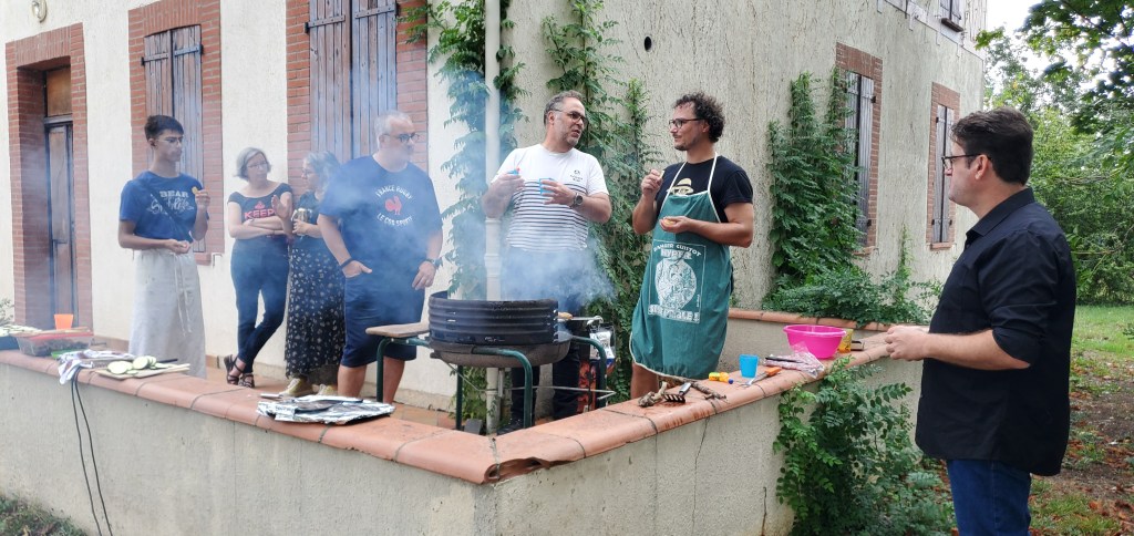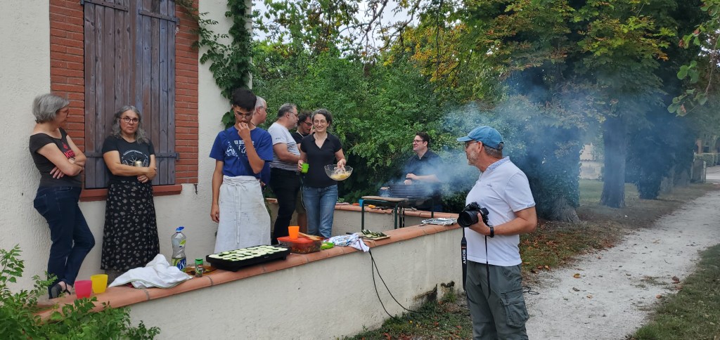 Dimanche 1er septembre nous faisions enfin ce barbecue tant attendu car reporté à cause du mauvais temps ! Certes le temps ce jour-là était menaçant mais au moins il n’a pas plus (ou très peu). Bref nous avons pu profiter pleinement des grillades de viande et de légumes, le tout agrémenté des plats à partager que chacun avait amené. L’ambiance était très conviviale !