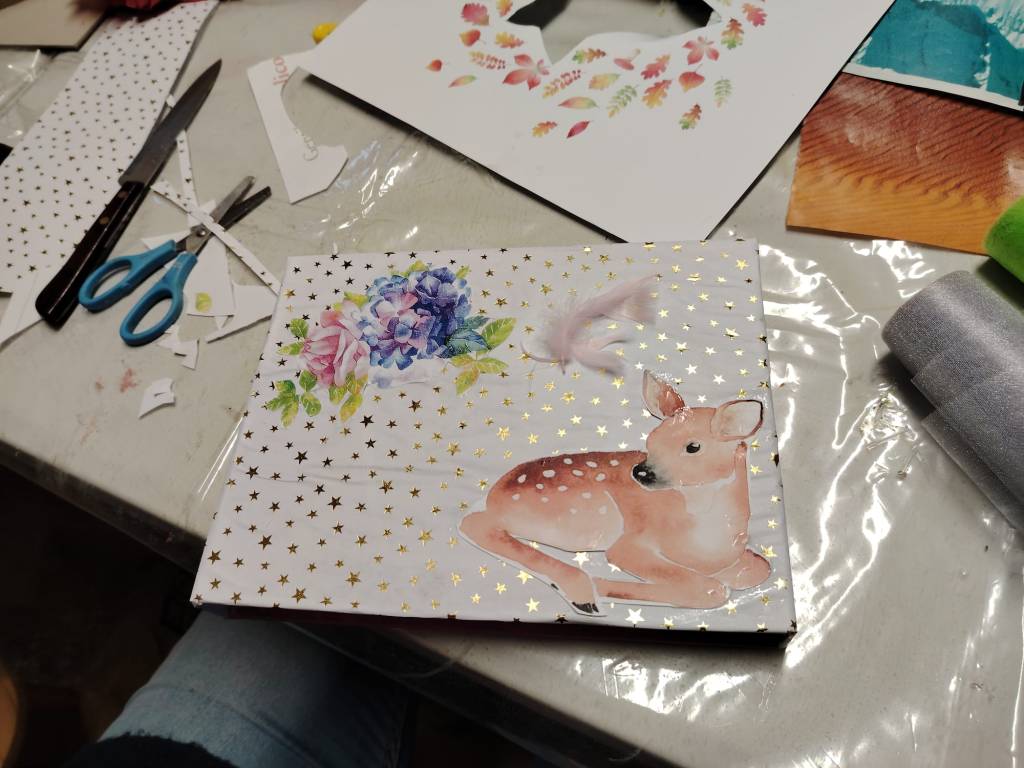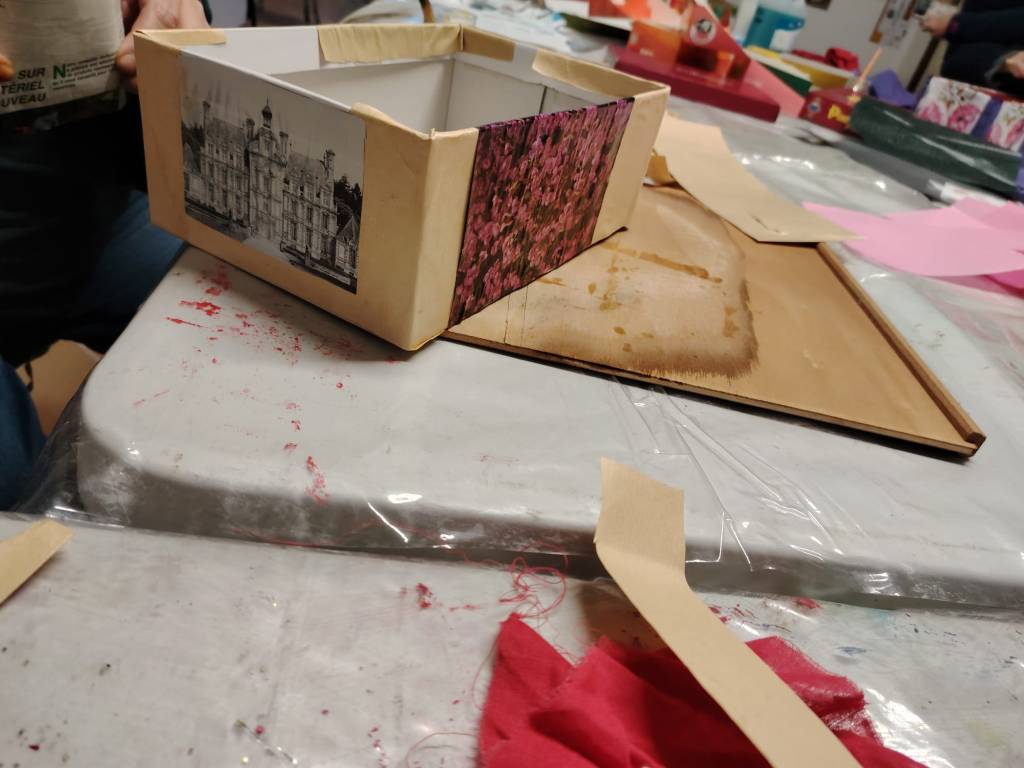 L’idée de cet atelier, animé samedi 7 décembre par Cathy, etait de recycler des vieux objets (boite chaussure ou autre vieille boite, petite valise, chaise, tabouret ,pied de lampe, petit meuble deco…) et de coller du papier dessus pour changer le look, pour en faire une « œuvre d’art unique et personnalisée ».