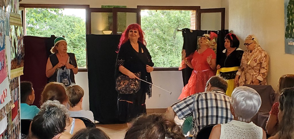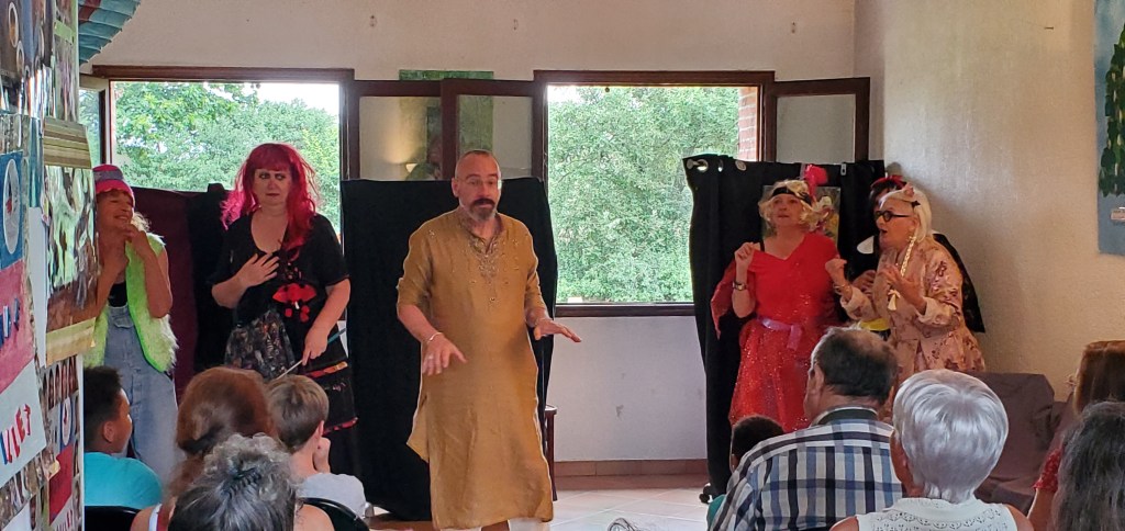 Après avoir assisté à une joyeuse représentation offerte par l’atelier théâtre, nous avons siroté une boisson fraîche en attendant la fin de la cuisson des saucisses, mergez et poulet offerts par l’association. Nous avons ensuite pu nous installer dans le parc, à l’ombre, afin d’échanger autour des plats que tout un chacun avait apportés.