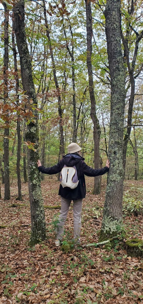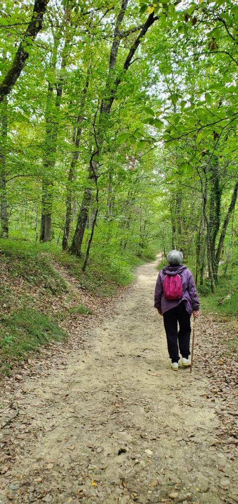 Petit à petit on se recentre sur soi, on entend le bruit de nos pas dans les feuilles mortes, le craquement des branches mortes, les arbres qui craquent doucement autour de nous, l’odeur de la mousse, et de temps en temps les oiseaux qui chantent. On caresse les feuilles, on est attentifs aux couleurs vertes et qui commencent à devenir cuivre. Puis à son ryhtme, on lâche les tensions, on baille, on se détend…