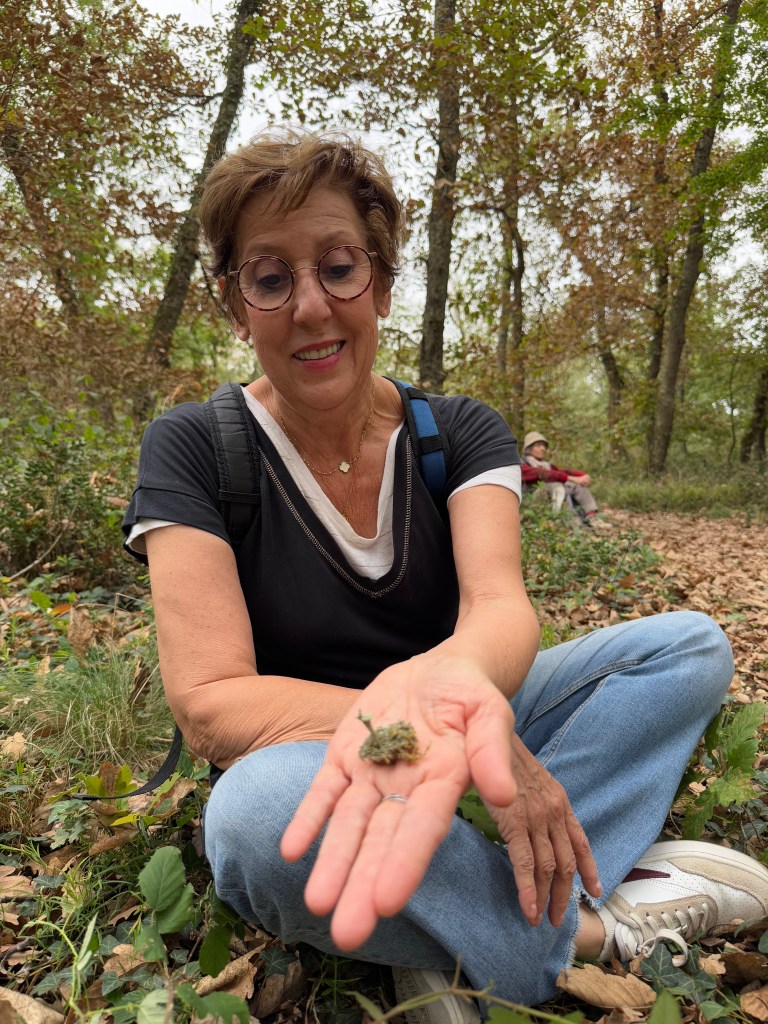 Au début pendant la balade, on prend le temps d’écouter, de sentir, de découvrir les formes des arbres et de les toucher, on ouvre ses mains aux brises du sous-bois.